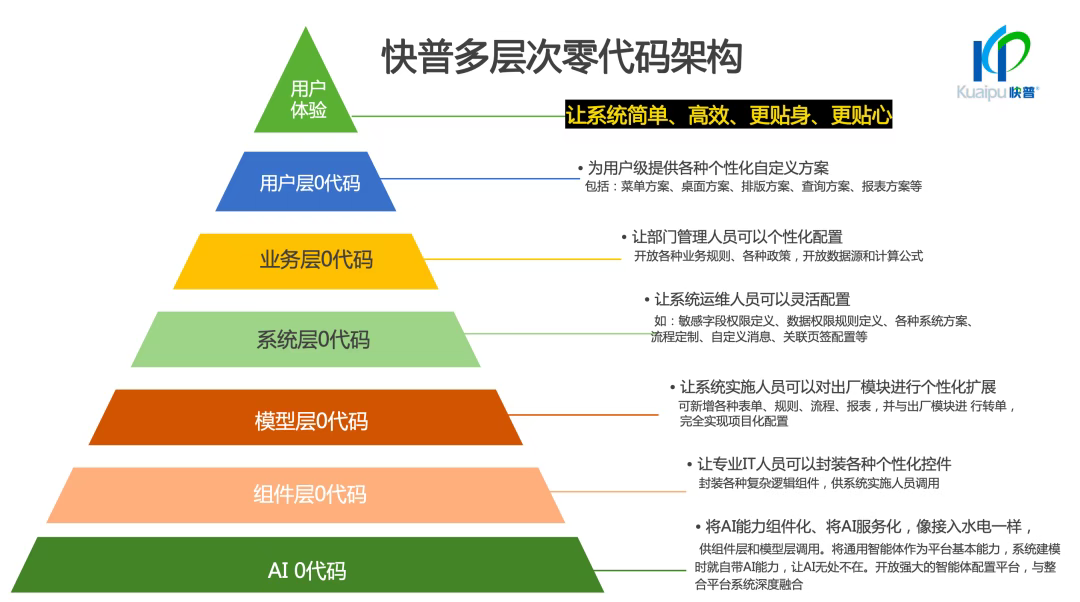 針對(duì)這一核心問題,溫董詳細(xì)闡釋了快普獨(dú)創(chuàng)的 “多層次零代碼架構(gòu)” 如何助力企業(yè)實(shí)現(xiàn)“小快輕準(zhǔn)”轉(zhuǎn)型: